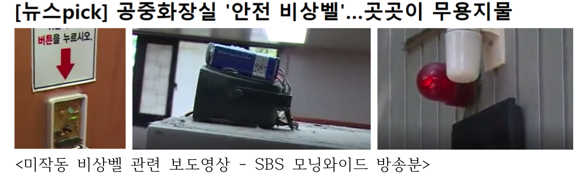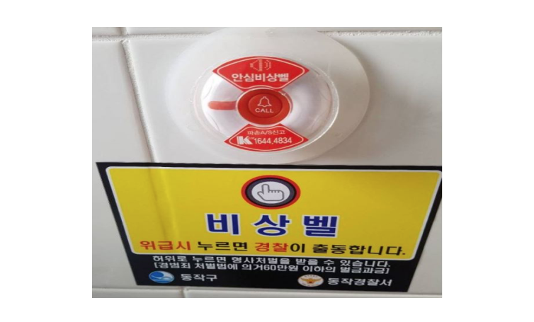 서울시 동작구는 위급상황 발생에 대한 불안감을 해소하고 안전을 확보하고자 공중화장실 15개소에 비상벨을 설치하고자 하였고, (주)에이치케이시스템은 서울시 동작구에 위치한 공중화장실 15개소에 88개의 비상벨을 설치하였음. [아시아경제, 2018.04.16.]