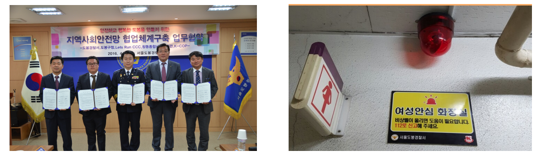 2016년 2월 서울 도봉경찰서와 ‘지역사회안전망 협업체계구축 업무협약’을 맺고 편의점 비상벨을 설치하였으며, 이에 착안하여 2016년 5월 창동 유흥가 지역 내 개방화장실 2곳에 화장실 비상벨을 시험 설치하여 ‘여성안심화장실’을 운영 중에 있음. 도봉경찰서는 ‘투샷 안전화장실 긴급시스템’의 원활한 운영을 위해 주기적 방범진단 및 집중순찰을 하고 있음.