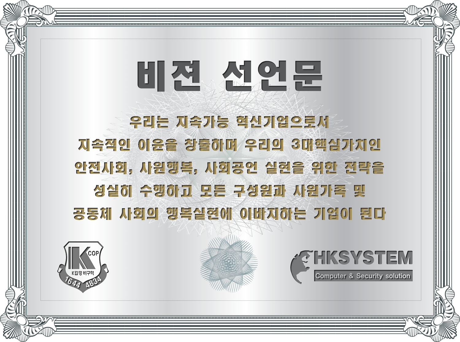 비젼 우리는 지속가능한 혁신기업으로서 지속적인 이윤을 창출하며 우리의 3대 핵심가치인 안전사회, 사원행복, 사회공헌 실현을 위한 전략을 성실히 수행하고 모든 구성원과 사원가족 및 공동체 사회의 행복실현에 이바지하는 기업이 된다.