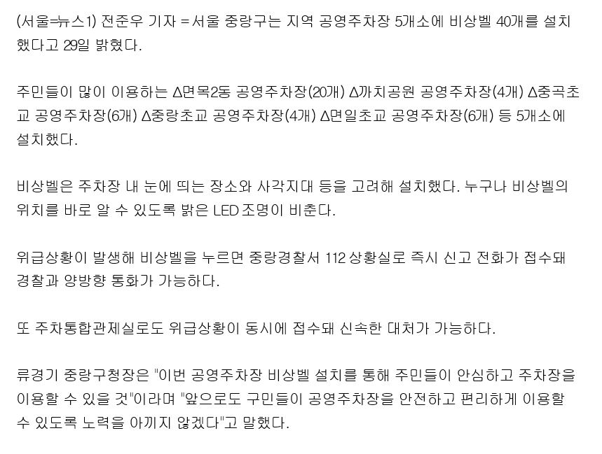 | 813 | 중랑구 공영주차장에 '비상벨'…누르면 경찰서 연결 | 2021-04-07 10:08:00 | 80 |